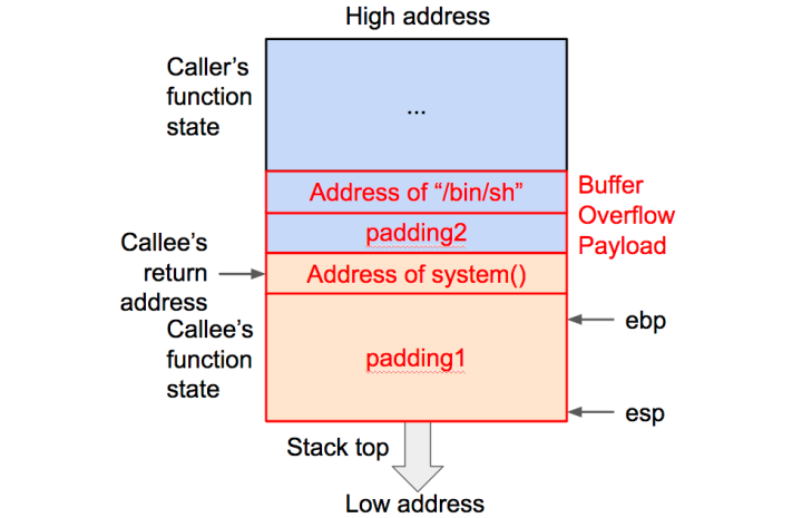 payload: padding1 + address of system() + padding2 + address of “/bin/sh”
