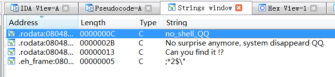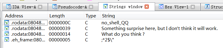搜索“/bin/sh”字符串,可通过string窗口或ROPgadget工具查找: