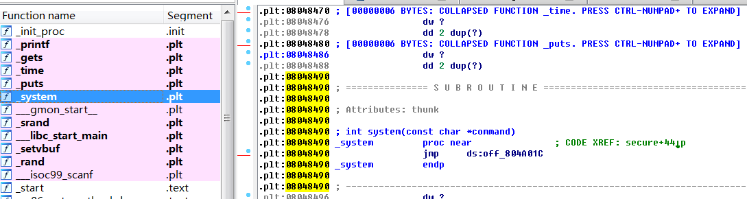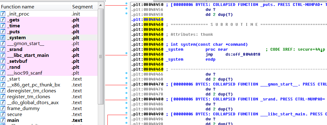 因为要从libc中寻找利用函数,则可以在ida直接查看plt中是否有system()函数,发现是存在有的且地址为0x08048460: