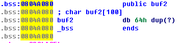寻找一块可读可写的buffer区,通常会寻找.bss段,使用IDA查看可看到存在buf2[100]数组:
