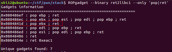 最后就是payload的构造了。因为在gets()函数完成后需要调用system()函数需要保持堆栈平衡,所以在调用完gets()函数后提升堆栈,这就需要add esp, 4这样的指令但是程序中并没有这样的指令。更换思路,通过使用pop xxx指令也可以完成同样的功能,在程序中找到了pop ebx,ret指令。通过ROPgadget工具查看,发现存在一条符合条件的指令,地址为0x0804841d: