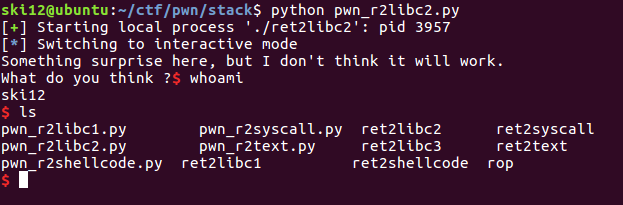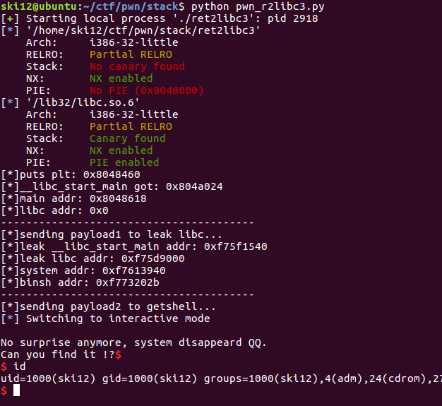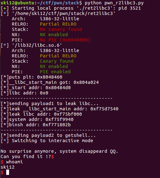 - 程序再次执行时填充padding,在函数返回地址处覆盖为libc中system()函数的真实地址,其中参数为libc中”/bin/sh”字符串的真实地址。