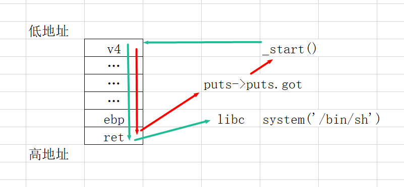 - 将puts()的plt地址覆盖到函数返回地址处,通过puts()泄露某个已执行过的函数的GOT地址,并且返回地址设置为_start()或main(),以便于重新执行一遍程序;