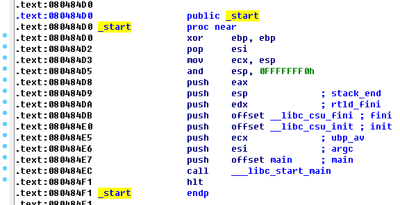 我们可以看下本题的_start()函数内容,其包含main()和__libc_start_main()函数的调用,也就是说,它才是程序真正的入口:
