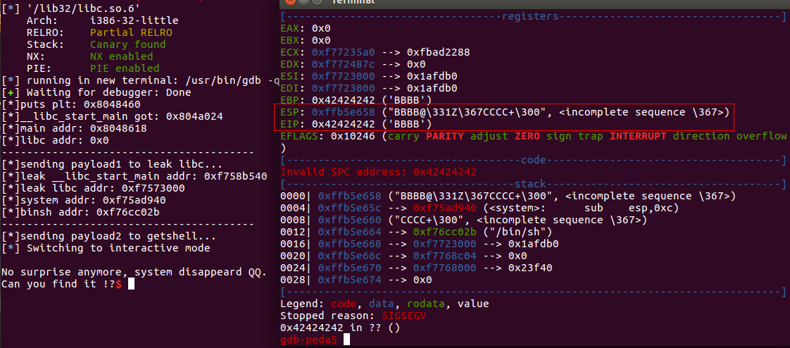 先将_start()换成main(),payload2的B字符的偏移量不变,运行脚本会报错,添加GDB调试交互发现溢出多了8个B: