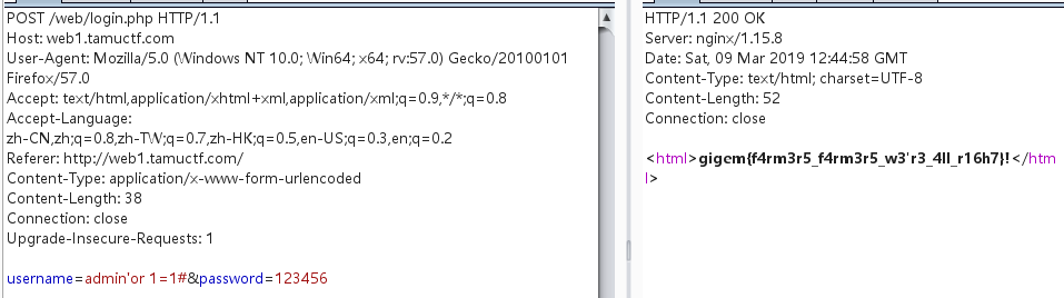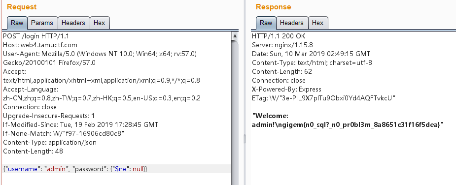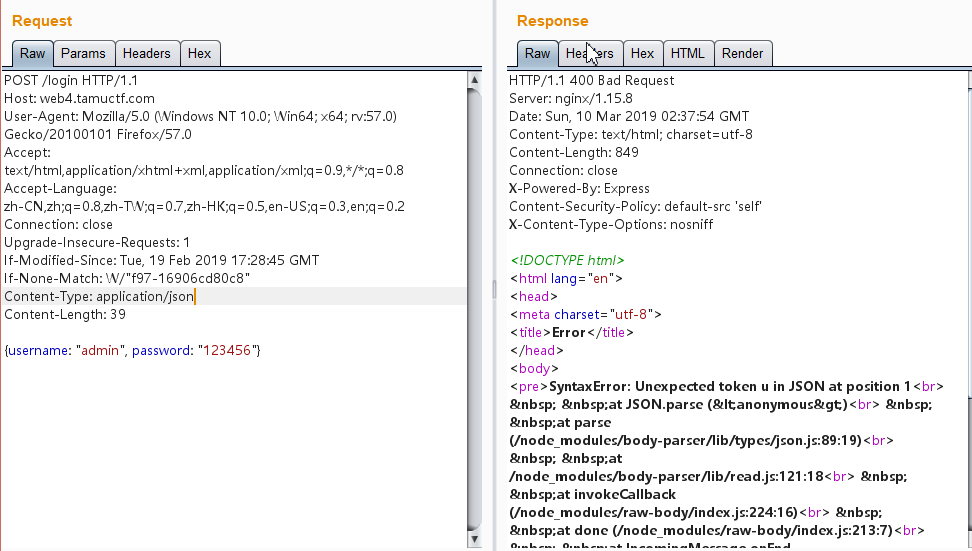虽然在页面中隐藏了注册表单,但是没啥用,因为后面的JS代码只会在id为submit的元素被点击时触发,而只有登录的表单含有该id元素;注意到JS代码的作用,它以POST方法请求的是/login,以Json格式上传username和password参数,Content-Type设置为application/json,构造报文尝试一下: