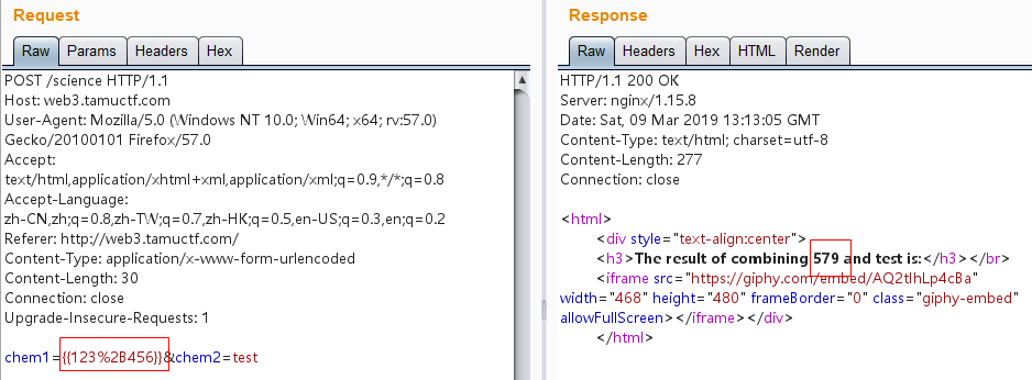验证一下,在其中一个输入框输入579,结果返回了该表达式执行的结果,证明了存在SSTI漏洞: