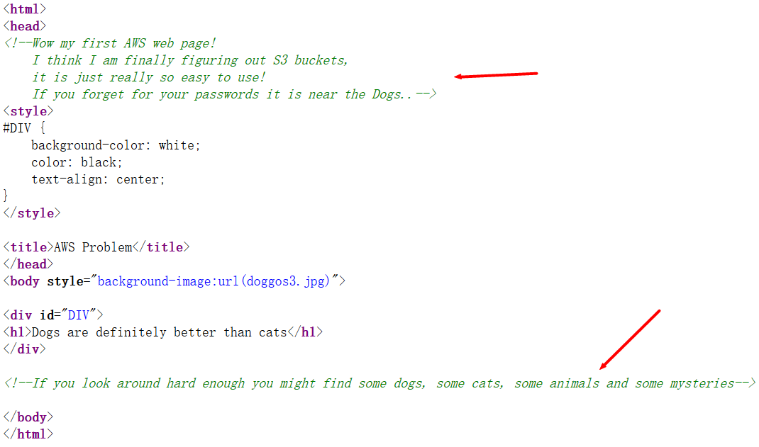 查看页面源码,有两段提示,大概说的是这是作者第一个AWS Web页面,用的是S3 buckets框架,且passowrd在Dogs附近: