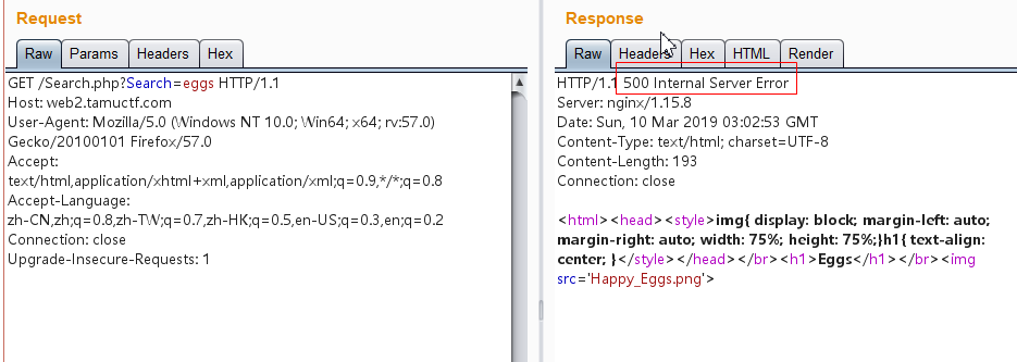 关注到页面并没有其他的功能点了,抓包也确认了确实只有Search.php的Search参数存在注入点,且页面没有直接返回错误信息,猜测应该就是SQL盲注吧,且在抓包过程发现,输入eggs即正常数据以及输入查询不到的数据,服务端都是返回500,但其他出错查询时就返回400: