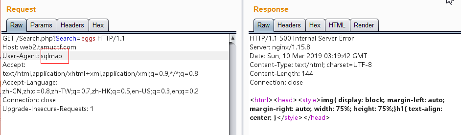 下面就上sqlmap跑起来,但是一开始没有跑出啥东西,经过测试发现是校验了UserAgent,后台对UserAgent为sqlmap的报文进行了过滤,而sqlmap默认的UA即包含sqlmap字样: