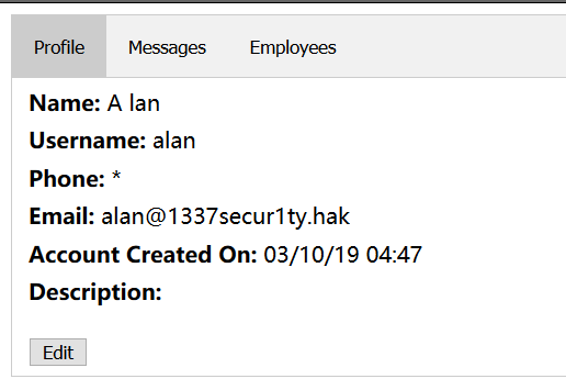 从这里可以分析得出,Alan是我注册的用户,这里ID为5,和cookie中userid为5是对应的,也就是说,1337-admin的userid为1,还需要知道它的cookie中secret的属性值才能登上admin的用户来访问。