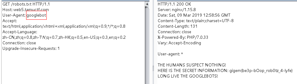 大致意思就是告诉它有一个Google robots,直接更换UserAgent为googlebot即谷歌爬虫,从而getflag: