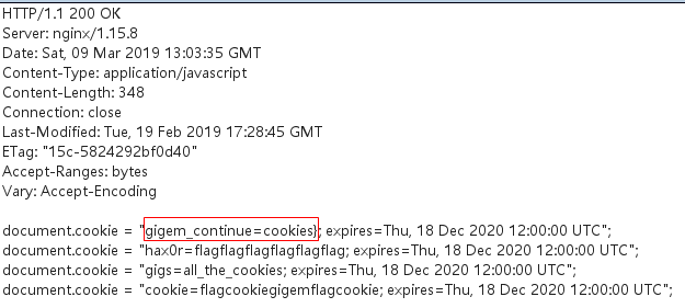 最后,根据cookies提示,查看报文的cookie值,其中有个cookies.js设置cookie值,看到其中关联的字符串gigem_continue=cookies}: