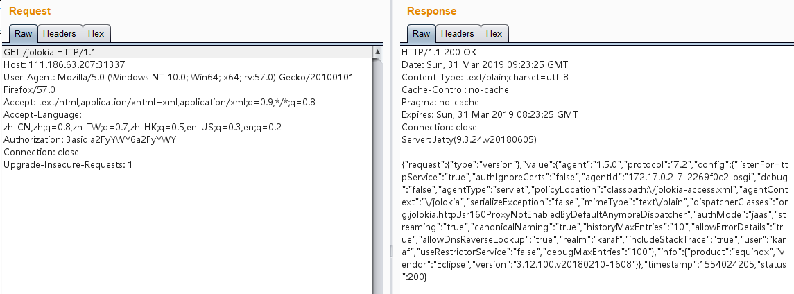| POST /jolokia/list HTTP/1.1 Host: 111.186.63.207:31337 Cache-Control: max-age=0 Authorization: Basic a2FyYWY6a2FyYWY= Upgrade-Insecure-Requests: 1 User-Agent: Mozilla/5.0 (Macintosh; Intel Mac OS X 10_14_3) AppleWebKit/537.36 (KHTML, like Gecko) Chrome/73.0.3683.75 Safari/537.36 Accept: text/html,application/xhtml+xml,application/xml;q=0.9,image/webp,image/apng,*/*;q=0.8,application/signed-exchange;v=b3 Accept-Language: zh-CN,zh;q=0.9,en;q=0.8 Cookie: JSESSIONID=h1fouerlv92j1nzj1rn7f4hyu Connection: close Content-Type: application/x-www-form-urlencoded Content-Length: 0