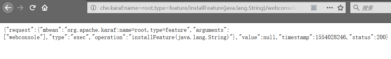 Karaf框架是拥有一个WebConsole的,可以通过Web端进行控制台的交互,前面我们获取了org.apache.karaf的所有支持的方法,找到其中的installFeature(),编写如下安装WebConsole的payload: