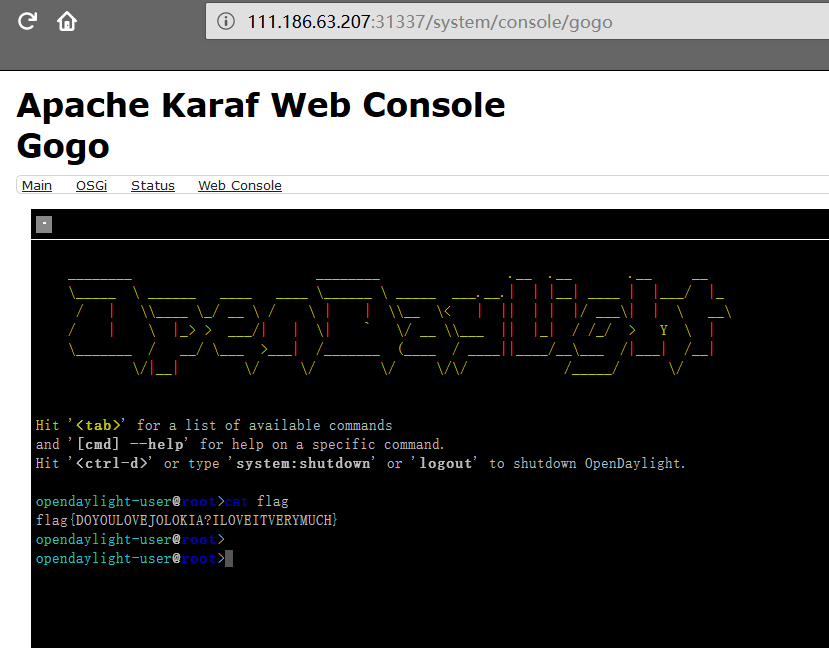 然后在URL栏访问Karaf的WebConsole界面,直接输入命令即可得到flag: