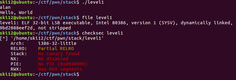 运行程序,输入一串字符串然后返回helloworld;file查看是个动态链接的32位文件;checksec查看所有安全编译选项都没有开: