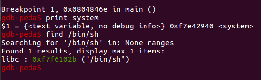 此时我们可以使用GDB进行调试,在main打下断点然后运行,程序在main断点处停下再通过print和find命令来查找system和”/bin/sh”字符串的地址: