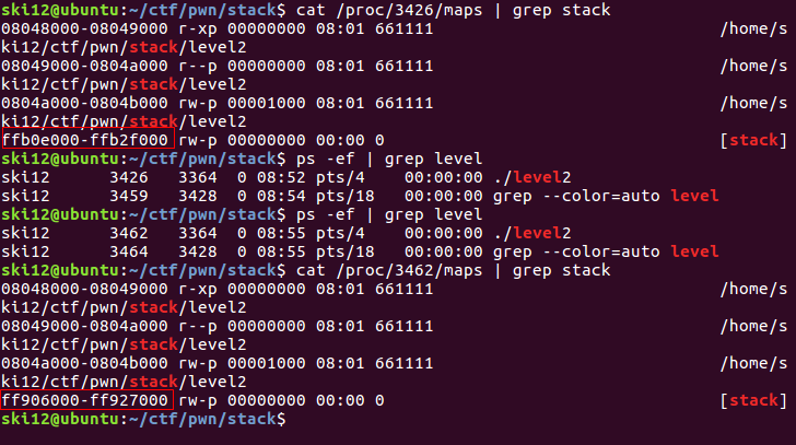 如果你通过sudo cat /proc/[pid]/maps或者ldd查看,你会发现level2的libc.so地址每次都是变化的: