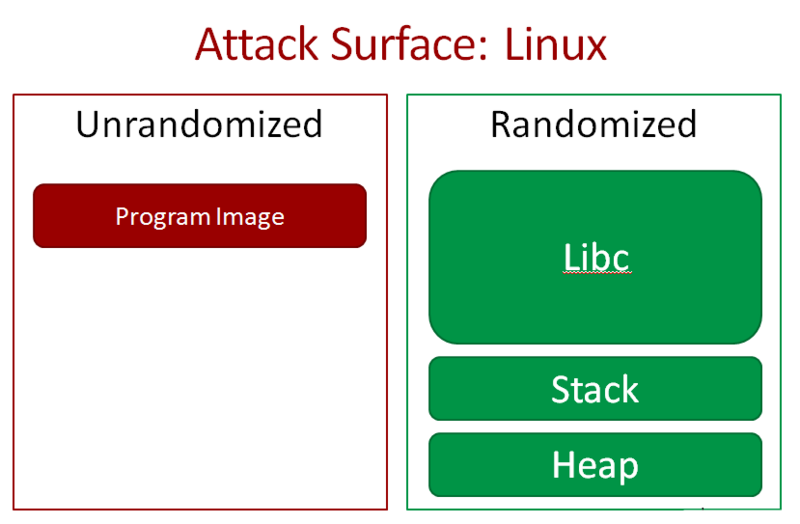 如何利用呢?——思路是:先泄漏出libc.so某些函数在内存中的地址,再利用泄漏出的函数地址根据偏移量计算出system()函数和/bin/sh字符串在内存中的地址,最后执行我们的ret2libc的shellcode。既然栈、libc、堆的地址都是随机的,我们怎么才能泄露出libc.so的地址呢?方法还是有的,因为程序本身在内存中的地址并不是随机的,如图所示,Linux内存随机化分布图: