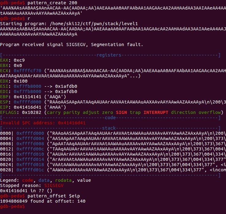 利用pattern计算偏移,可得到溢出偏移量为140:
