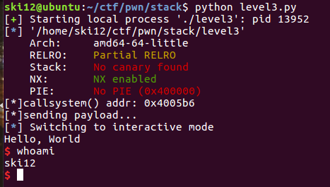 elf = ELF("./level3") callsystem_addr = elf.symbols["callsystem"] print "[*]callsystem() addr: " + hex(callsystem_addr)