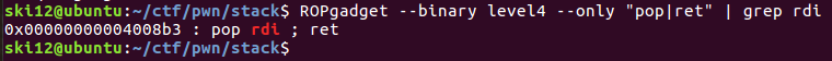 因为我们知道了溢出偏移量和system()函数的地址,剩下的就是通过寄存器给system()函数传参了,而在64位中传参的前六个参数是通过寄存器来实现的,而且system()只接受一个参数,因此我们需要找到一条pop rdi;ret的Gadget来帮助我们实现,这里我们用的是ROPgadget工具帮我们查找:
