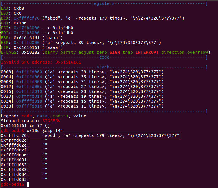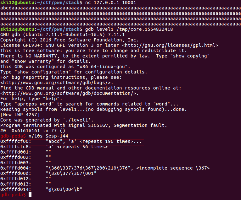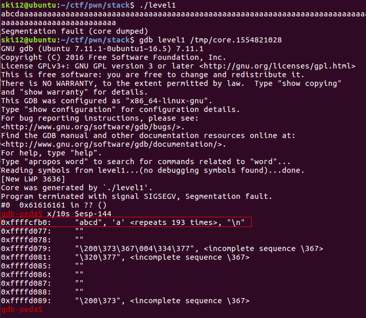在GDB中调试level1,r运行,再输入”abcdaaaaa……”让程序崩溃,然后输入x/10s \$esp-144(144是由前面得到的140偏移再加上4字节的ret得到的):