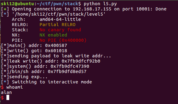 elf = ELF('level5') libc = elf.libc main = elf.symbols['main'] bss_addr = elf.bss()