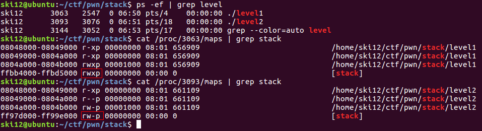 这时候我们如果使用level1的exp来进行测试的话,系统会拒绝执行我们的shellcode。如果你通过sudo cat /proc/[pid]/maps查看,你会发现level1的stack是rwx的,但是level2的stack却是rw的。