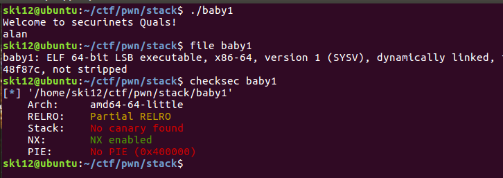 这里以Securinets CTF的一道Pwn题baby1为例。
