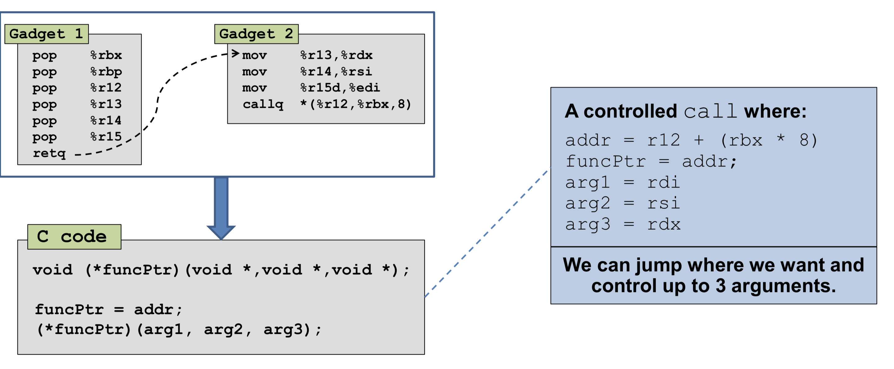 下面看下这两段可以利用的Gadgets,具体的描述前面已讲解,这里的图片更具体地表现出来了: