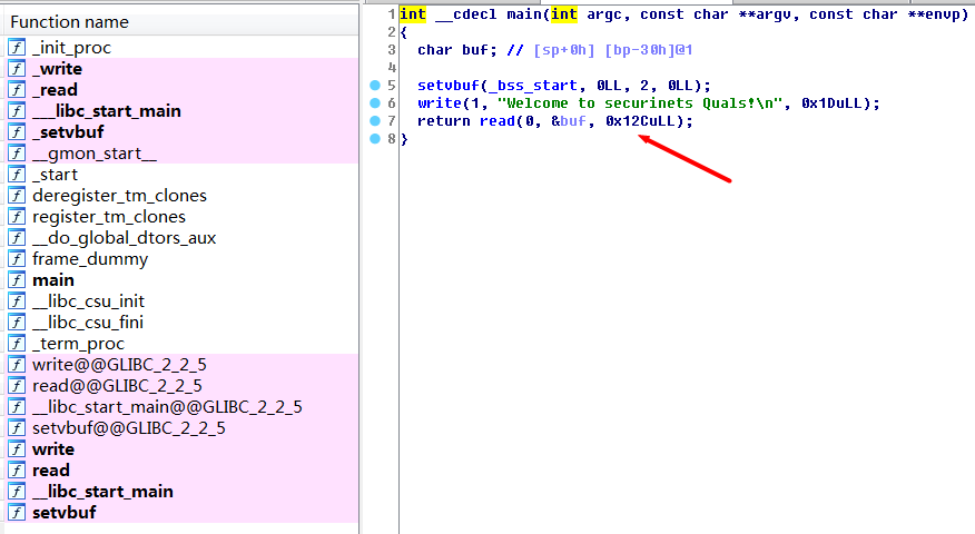 IDA分析下,存在明显的栈溢出漏洞,但在程序中找不到system()函数和”/bin/sh”字符串,但是可看到其是存在read()、write()和__libc_csu_init()函数的,由此可以联想到可以利用ret2csu技术来实现攻击: