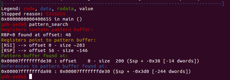GDB调试,使用pattern计算溢出字节为56: