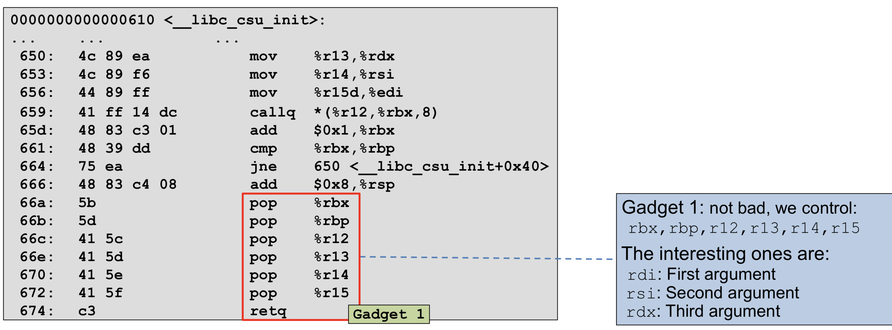 | 0000000000400660 <__libc_csu_init>: 400660: 41 57 push %r15 400662: 41 56 push %r14 400664: 41 89 ff mov %edi,%r15d 400667: 41 55 push %r13 400669: 41 54 push %r12 40066b: 4c 8d 25 9e 07 20 00 lea 0x20079e(%rip),%r12 # 600e10 <__frame_dummy_init_array_entry> 400672: 55 push %rbp 400673: 48 8d 2d 9e 07 20 00 lea 0x20079e(%rip),%rbp # 600e18 <__init_array_end> 40067a: 53 push %rbx 40067b: 49 89 f6 mov %rsi,%r14 40067e: 49 89 d5 mov %rdx,%r13 400681: 4c 29 e5 sub %r12,%rbp 400684: 48 83 ec 08 sub $0x8,%rsp 400688: 48 c1 fd 03 sar $0x3,%rbp 40068c: e8 e7 fd ff ff callq 400478 <_init> 400691: 48 85 ed test %rbp,%rbp 400694: 74 20 je 4006b6 <__libc_csu_init+0x56> 400696: 31 db xor %ebx,%ebx 400698: 0f 1f 84 00 00 00 00 nopl 0x0(%rax,%rax,1) 40069f: 00 4006a0: 4c 89 ea mov %r13,%rdx 4006a3: 4c 89 f6 mov %r14,%rsi 4006a6: 44 89 ff mov %r15d,%edi 4006a9: 41 ff 14 dc callq *(%r12,%rbx,8) 4006ad: 48 83 c3 01 add $0x1,%rbx 4006b1: 48 39 eb cmp %rbp,%rbx 4006b4: 75 ea jne 4006a0 <__libc_csu_init+0x40> 4006b6: 48 83 c4 08 add $0x8,%rsp 4006ba: 5b pop %rbx 4006bb: 5d pop %rbp 4006bc: 41 5c pop %r12 4006be: 41 5d pop %r13 4006c0: 41 5e pop %r14 4006c2: 41 5f pop %r15 4006c4: c3 retq 4006c5: 90 nop 4006c6: 66 2e 0f 1f 84 00 00 nopw %cs:0x0(%rax,%rax,1) 4006cd: 00 00 00