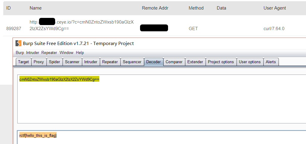 发送之前,先进行URL编码,最后在ceye收到内容,base64解码即为flag:
