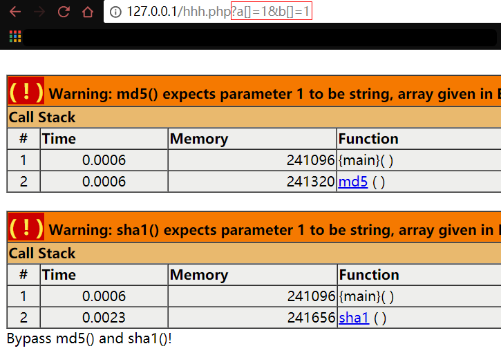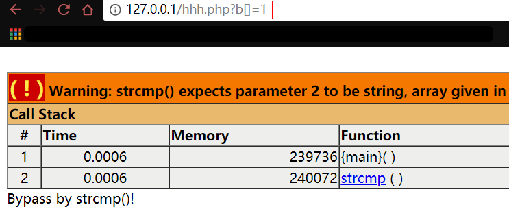 在本地测试的PHP版本是5.6,处理弹出警告信息说第二个参数应该给string型外,还是能够成功Bypass: