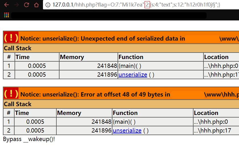 在如下情形中,在序列化字符串中,前面的数字代表的是后面字符串中字符的个数,如果数字与字符个数不匹配的话,就会报错,因此将1改成2会产生报错,导致不会去执行__wakeup()函数,从而Bypass:
