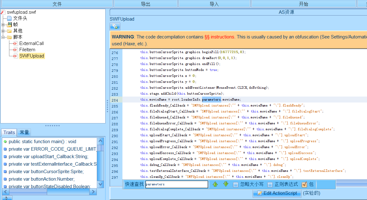将文件下载下来后,反编译得到as源代码,可以看到脚本是有三个,这里先关注SWFUpload的代码: