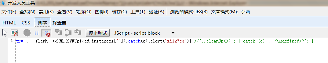 在IE下调试,可以看到底层被恶意构造输入注入的执行的JS代码: