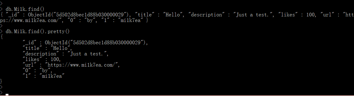 插入成功后,到数据库中确认,这里pretty()方法以格式化的方式来显示所有文档。: