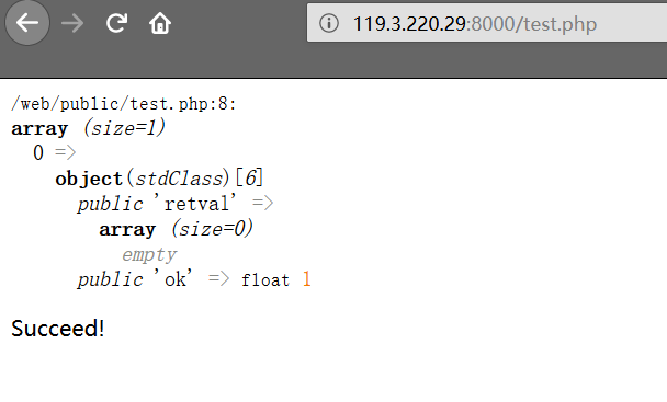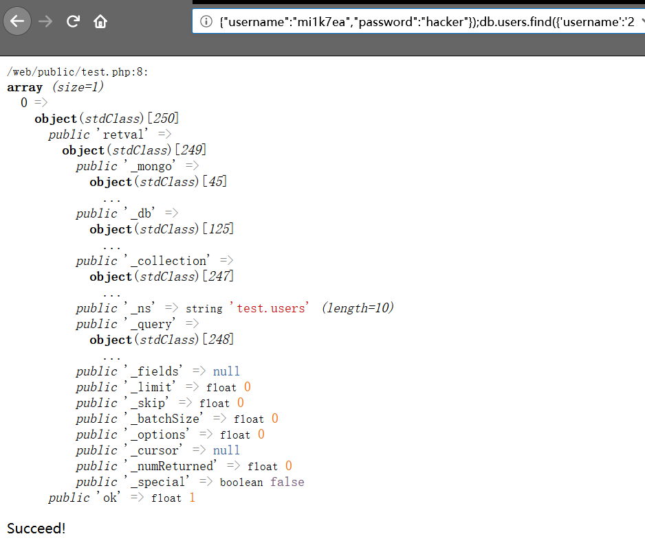 | <?php $manager = new MongoDB\Driver\Manager('mongodb://mongo:27017'); $username = $_GET['username']; $cmd = new MongoDB\Driver\Command([ 'eval'=> "db.users.distinct('username',{'username':'$username'})" ]); $cursor = $manager->executeCommand('test', $cmd)->toArray(); var_dump($cursor); if(count($cursor)>0){ echo 'Succeed!'; } else{ echo 'Failed!'; } ?>