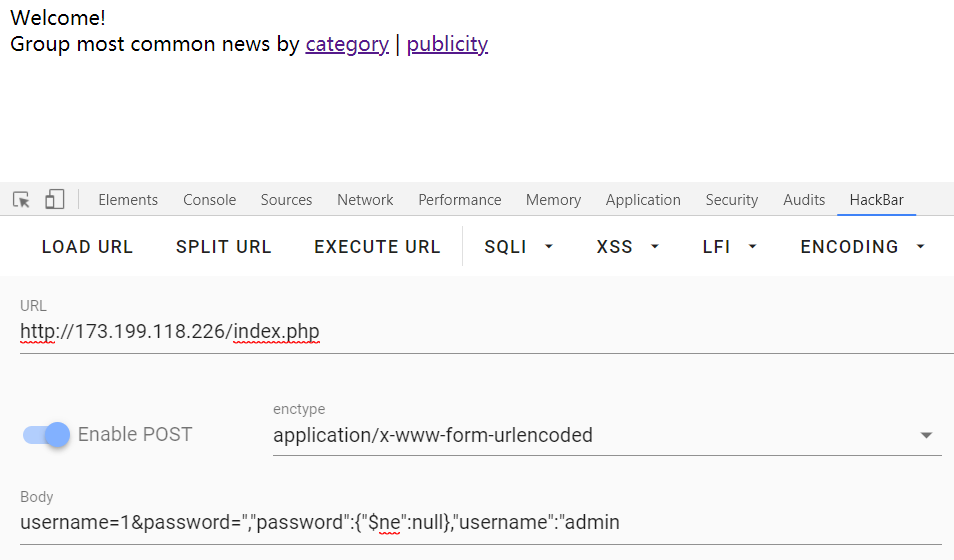 这里看下CyBRICS CTF Quals 2019的NopeSQL题目:http://173.199.118.226/index.php