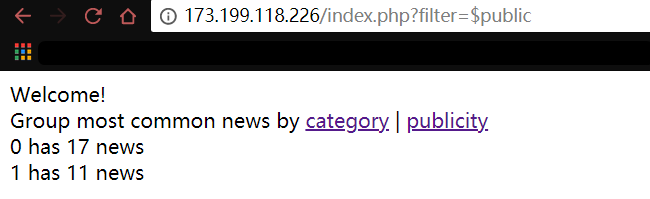 Welcome! <div> Group most common news by <a href="?filter=$category">category</a> | <a href="?filter=$public">publicity</a><br> </div>