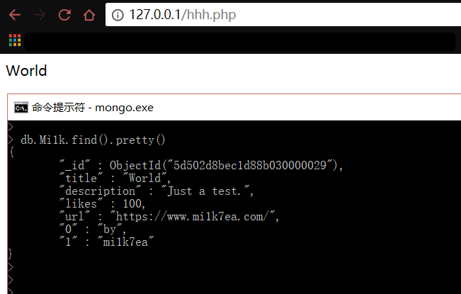 访问之后,即删除了title为World的文档,在数据库中查不到Mi1k集合的文档内容了。